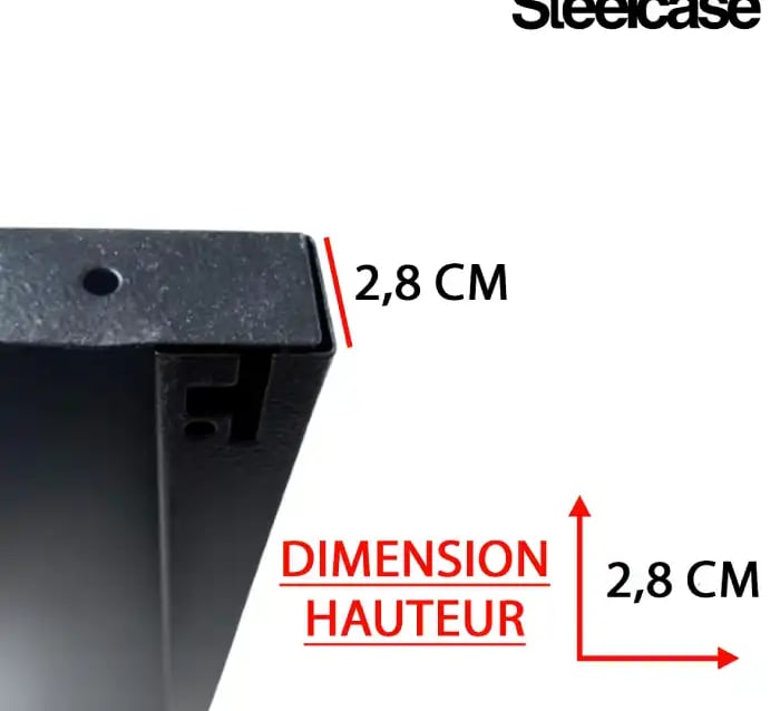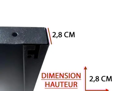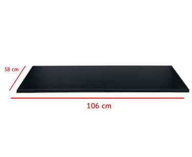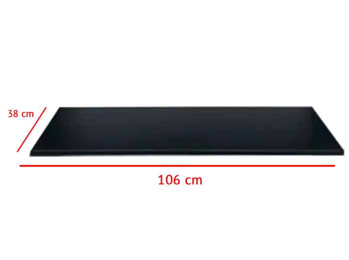 Dimensions 106x38x2,8 cm. Acier noir, charge 120 kg. 4 taquets inclus.