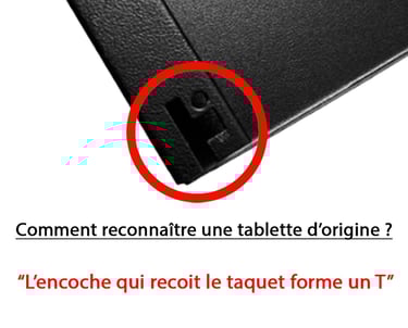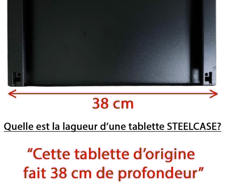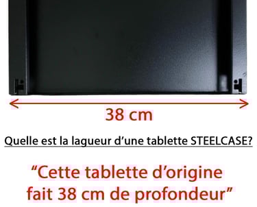 Tablette métallique en acier noir, origine Steelcase. Emballage d’origine parfois manquant. Taquets compatibles inclus.